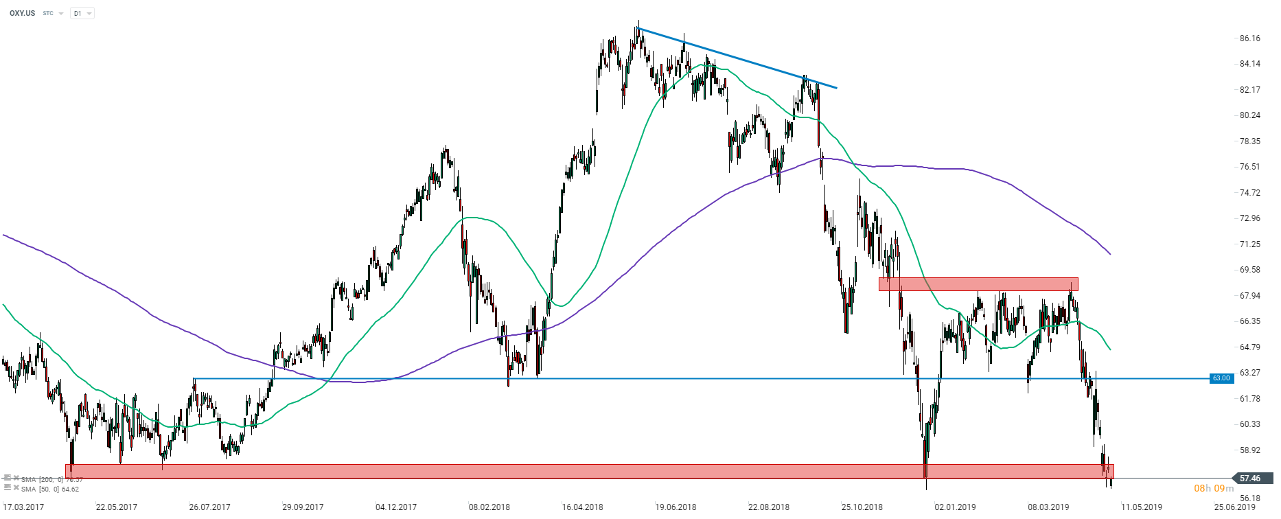 Occidental Petroleum (OXY.US) ha tenido un bajo desempeño en la mayor parte de abril, ya que los mercados vieron que su oferta de Anadarko (APC.US) era demasiado alta. Las acciones disminuyeron hacia la zona de soporte a largo plazo que oscila entre $ 57.40-58.20. Un rebote más alto podría ser entregado desde allí, pero uno debería tener en cuenta que el sentimiento es bastante bajista. Fuente: xStation5