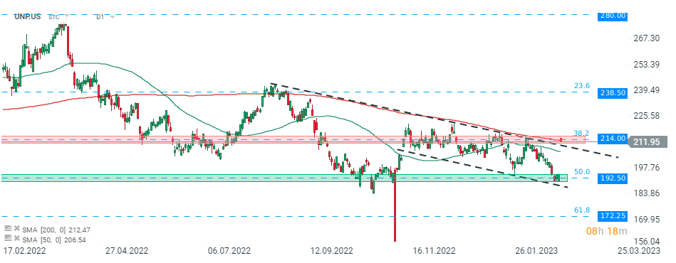 Las acciones de Union Pacific (UNP.US) iniciaron la sesión de hoy con una brecha de precios alcista y están probando una zona de resistencia clave en $214,00, que está marcada por reacciones de precios anteriores, el límite inferior del canal descendente local y un retroceso de Fibonacci del 38,2 % de la onda ascendente lanzada en Marzo de 2020. Si los compradores logran empujar el precio por encima del nivel mencionado anteriormente, el kve al alza puede acelerarse hacia la próxima resistencia en $ 238.50. Por otro lado, si los vendedores logran detener las caídas, entonces se puede lanzar otro movimiento a la baja hacia el soporte en $ 192.50. Fuente: xStation5