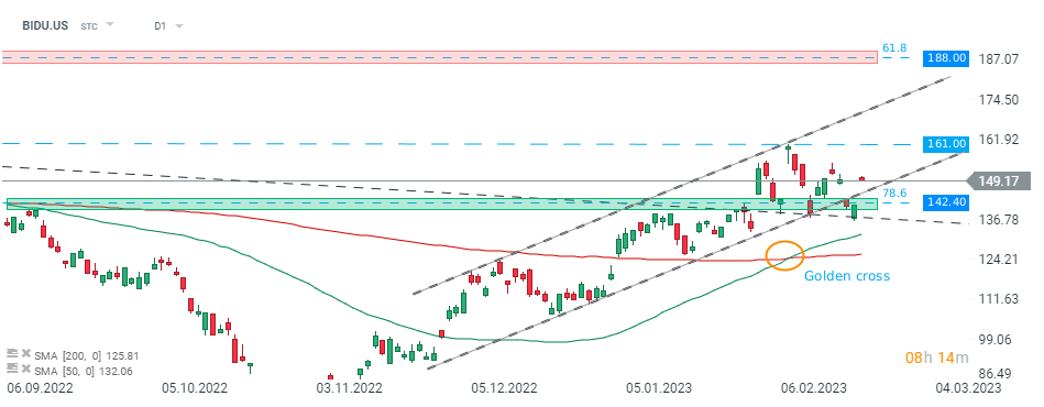 Las acciones de Baidu (BIDU.US) iniciaron la sesión de hoy con una brecha de precio alcista, ya que los compradores lograron defender un soporte crucial en 142,40$, lo que coincide con un retroceso de Fibonacci del 78,6 % de la ola alcista que comenzó en marzo de 2020. Actualmente, el precio se acerca a un máximo reciente en 161,00$ y si los alcistas logran mantener el impulso reciente, el movimiento alcista puede extenderse hacia la próxima resistencia en 188,00$. Fuente: xStation5