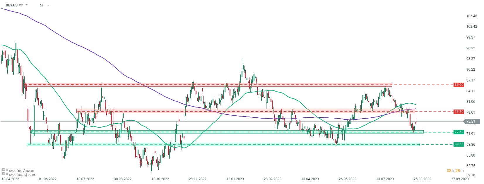 Best Buy (ABY.US) ganó en el premercado después de la publicación de los resultados empresariales del segundo trimestre fiscal, pero borró todas esas ganancias antes de que se iniciara la sesión de efectivo. Las acciones rebotaron ayer en el soporte de 72,50 dólares y, si este rebote se extiende, lo siguiente podría ser una prueba de la zona de resistencia de 78,30 dólares. Fuente: xStation5