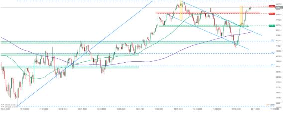 El SP500 cotizan con pocos cambios durante el día. Si observamos el gráfico del SP500 en el intervalo D1, podemos ver que el movimiento ascendente en curso se desaceleró después de que el precio alcanzó el área de 4.580 pts, marcada con el rango de libro de texto de la ruptura alcista del canal bajista. Dado lo rápidas y pronunciadas que fueron las ganancias recientes, no se puede descartar una corrección. En caso de que veamos que el índice comienza a retroceder, la primera zona de soporte a corto plazo a observar se puede encontrar en el área de 4,500 pts.