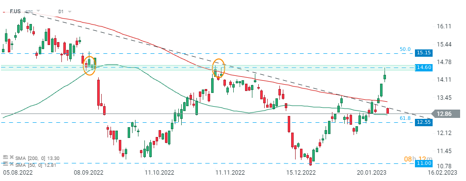 Las acciones de Ford (F.US) subieron más del 30,0 % desde finales de diciembre de 2022, sin embargo, la subida se detuvo en torno a una resistencia importante de 14,60 dólares, que está marcada por reacciones de precios anteriores. Las nuevas cifras trimestrales proporcionan combustible para los vendedores y las acciones se lanzaron en la sesión de hoy con una brecha de precios bajista. Si prevalece el sentimiento actual, la liquidación puede profundizarse hacia el soporte en $ 12.55, que coincide con el retroceso de Fibonacci de 61.85 del movimiento alcista iniciado en marzo de 2020, la línea de tendencia a la baja rota anteriormente y la media simple de 200 (línea roja). Fuente: xStation5