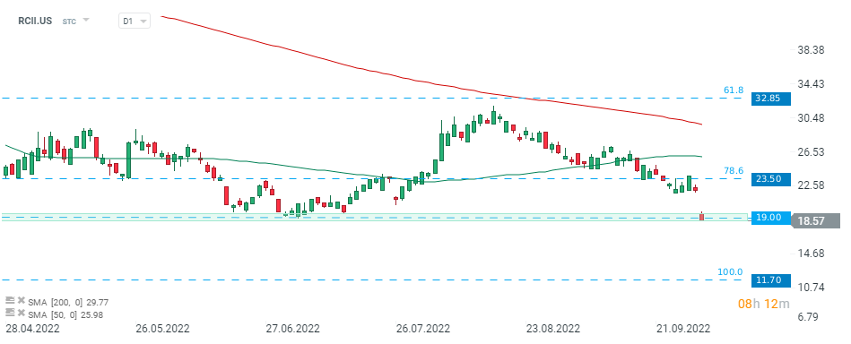 Las acciones de Rent-A-Center (RCII.US) lanzaron la sesión de hoy con una enorme brecha de precios bajista, por debajo del límite inferior de la consolidación reciente en $19,00, que ahora actúa como resistencia. Si prevalece el sentimiento actual, el movimiento a la baja puede acelerarse hacia el soporte en $11.70, donde se encuentran los mínimos pandémicos. Fuente: xStation5