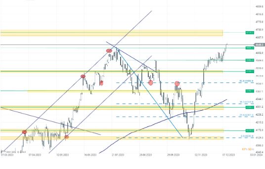 El US500 cotiza hoy en torno a los precios de cierre de ayer. El índice sube un modesto 0,05%. Sin embargo, las cotizaciones se mantienen en máximos de 23 meses, por encima del máximo local de mitad de año de 4.630 puntos. Definitivamente, toda la atención del mercado se centra en la última conferencia y en la decisión del FOMC de este año. El mercado buscará pistas en el discurso del presidente Jerome Powell sobre la perspectiva de los primeros recortes de tipos de interés. Fuente: xStation 5