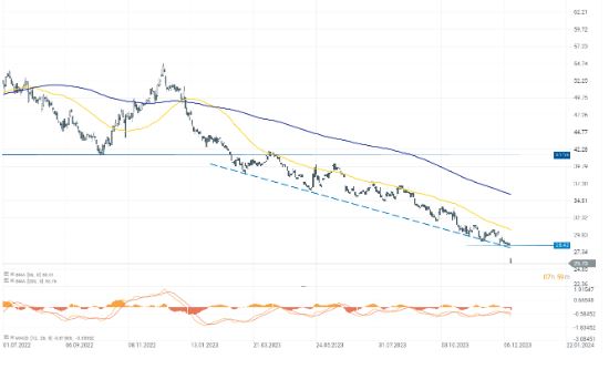 El precio de las acciones de Pfizer cae hoy a su nivel más bajo desde 2013, sin incluir una caída de un día durante la pandemia de Covid-19 en 2020. Fuente: xStation 5