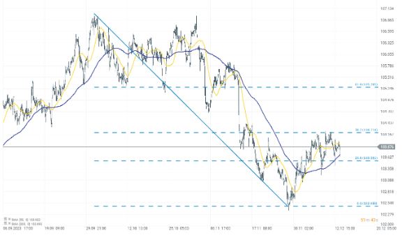 Después de la reciente corrección más profunda, el dólar estadounidense ha detenido su caída alrededor de 102,3 puntos. Aunque el dólar comenzó a fortalecerse nuevamente desde finales de noviembre, las subidas se han detenido en el retroceso de Fibonacci del 38,2%, alrededor de 104,4 puntos. La publicación hoy de la decisión de la Reserva Federal sobre los tipos de interés y el discurso del presidente Jerome Powell serán cruciales para determinar la tendencia de las próximas semanas. Fuente: xStation 5