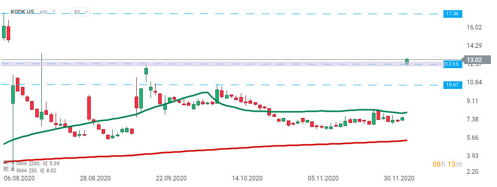 Las acciones de astman Kodak (KODK.US) se lanzaron en la sesión de hoy con una brecha de precios alcista masiva y el precio logró romper por encima de la resistencia principal en 12,65 dólares. Si prevalece el sentimiento actual, entonces puede entrar en juego la próxima resistencia en USD 17,36. Fuente: xStation5