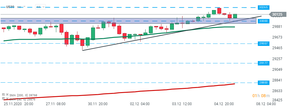 US30: el índice rebotó en la línea de tendencia alcista que además se ve reforzada por un soporte importante en 30 000pts. Si los compradores logran mantener el impulso, entonces ATH en 30265 pts podría estar en riesgo. Por otro lado, si los compradores logran romper por debajo de la zona de soporte antes mencionada, entonces se podría lanzar un impulso a la baja hacia el nivel de 29 557 pts. Fuente: xStation5.