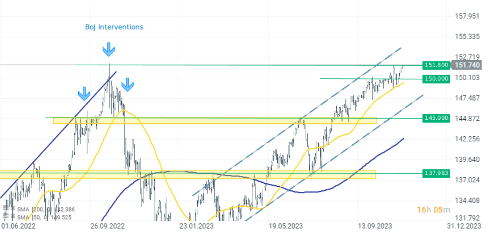 El yen japonés pierde frente al dólar estadounidense en la jornada de hoy. El USDJPY sube 2 décimas hasta los 151,75. El tipo de cambio está al borde de su último máximo de finales de octubre de 2022, cuando el USDJPY cerró en 151,8, seguido de la intervención del BoJ.