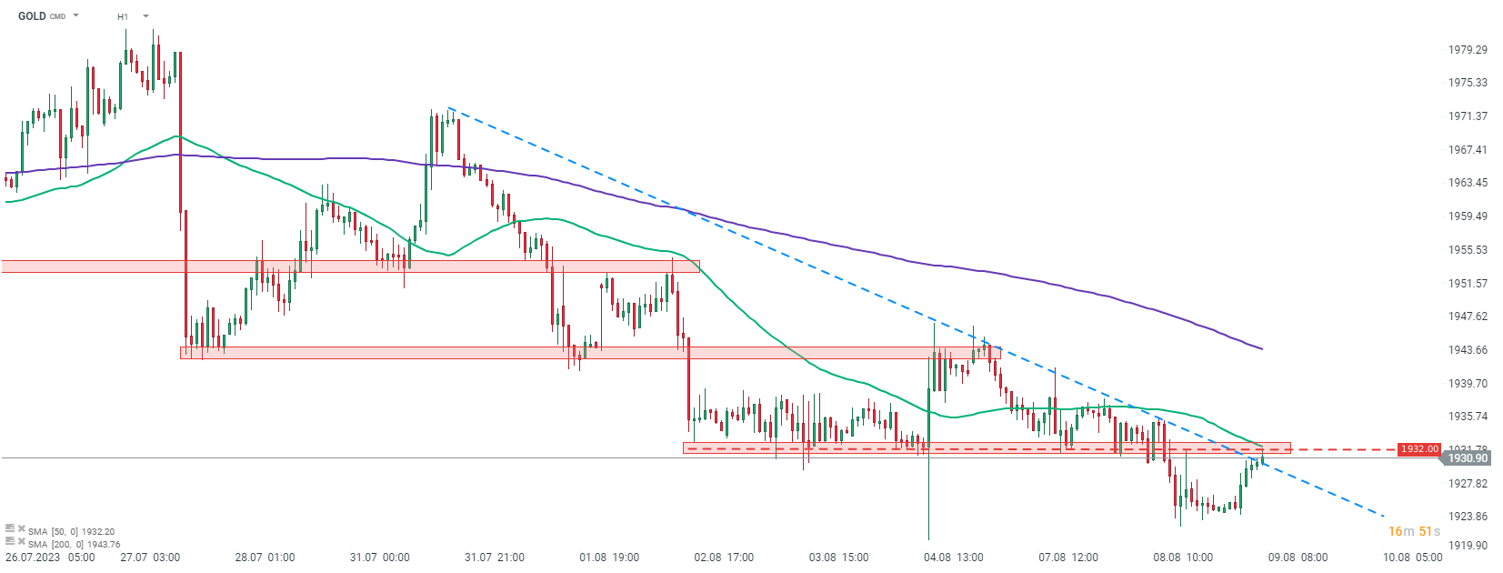 GOLD benefits from today's USD weakness and tries to climb back above the $1,932 price zone. Source: xStation5