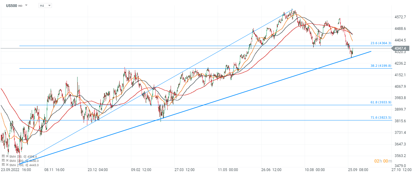 El S&P 500 actualmente se negocia a 4347 puntos y rebota en la línea de tendencia. Sin embargo, al mismo tiempo, los contratos aún se negocian por debajo del retroceso de Fibonacci del 23.6 de la onda ascendente de 2022, y las medias móviles clave en el intervalo H4 han rodado hacia abajo señalando una fuerte oferta. La resistencia clave para los toros parece ser el nivel de 4400 puntos, lo que podría indicar que la caída por debajo del 23.6 Fibo fue solo temporal. Fuente: xStation5