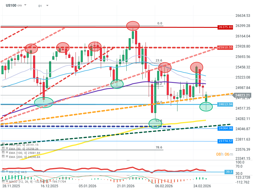 Fuente: xStation5. En la primera apertura de la semana, el mercado defiende claramente la línea de resistencia alrededor de los 24.615 puntos y vuelve por encima de la línea de tendencia de corto plazo. Para los compradores, el nivel clave a defender sigue siendo la línea de tendencia (naranja). Si los vendedores quieren mantener la iniciativa y profundizar la caída, será crucial empujar el precio hacia el nivel de la EMA200 y la línea de tendencia de largo plazo.