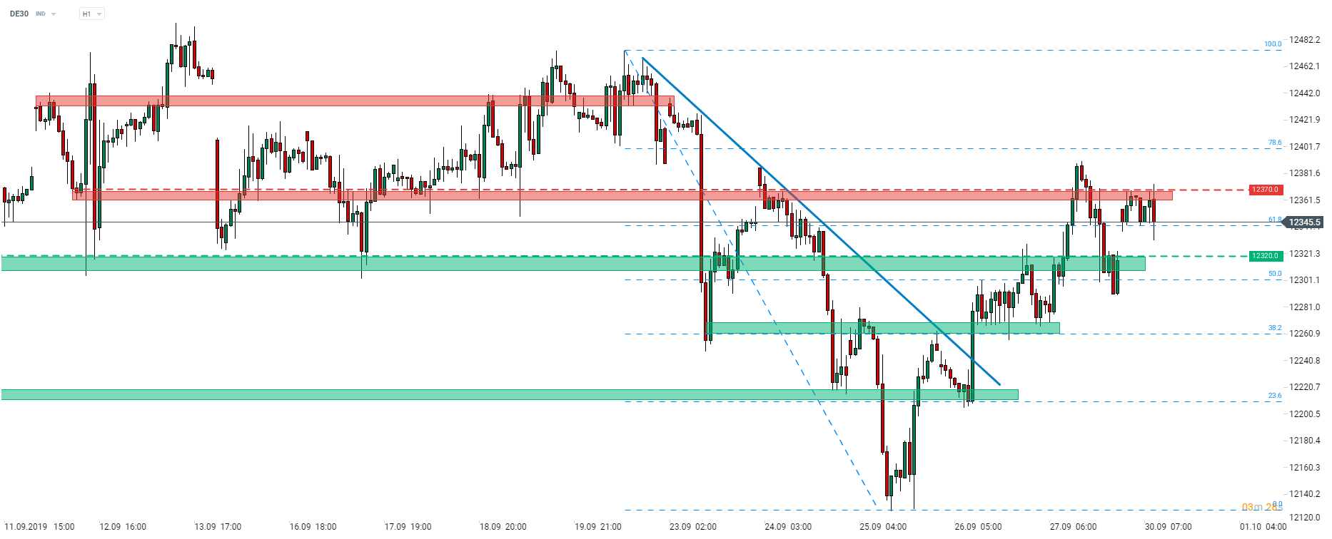 El DE30 (subyacente de futuros DAX) lanzó una nueva semana más alta. El comercio durante la sesión asiática estuvo limitado en el rango con un nivel de Fibo del 61,8% del 20 al 25 de septiembre del movimiento descendente (12340 pts) que actúa como un límite inferior y una resistencia de 12370 pts que actúa como un límite superior. El índice alemán intentó quebrar por debajo de este rango al comienzo de la sesión de caja europea, pero no lo hizo. Los dos niveles mencionados anteriormente deberían seguir actuando como límites a corto plazo del rango de negociación. Una ruptura de esta consolidación podría acelerar el movimiento de los precios. En tal escenario, los operadores deberían centrarse en 12320 pts como el próximo soporte en línea y en 12400 pts (78.6% nivel Fibo) como la próxima resistencia a observar.