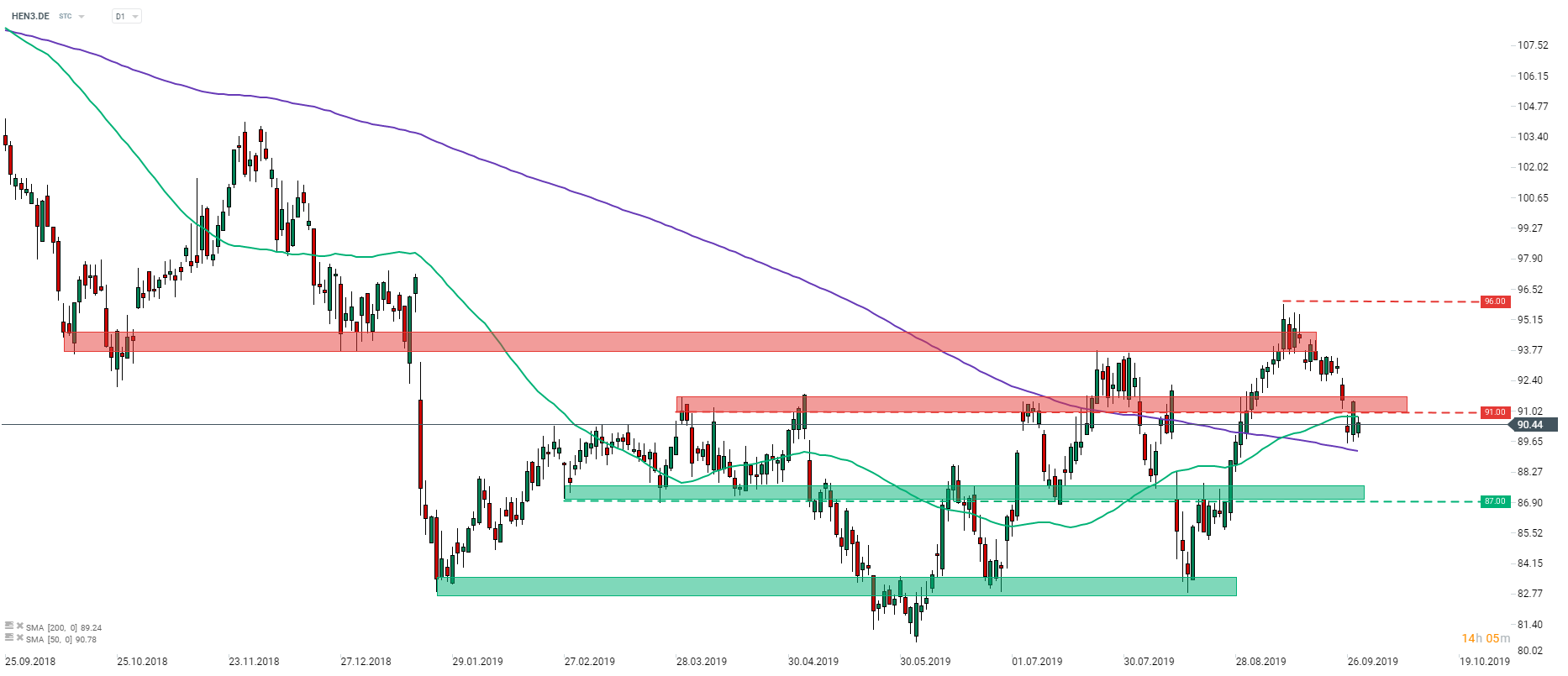 Henkel (HEN3.DE) continúa con un retroceso iniciado ligeramente por debajo del nivel de 96 euros. Las acciones rompieron por debajo de la zona de precios a corto plazo, por encima del nivel de 91 euros. El siguiente soporte importante es la media móvil de 200 sesiones (línea púrpura, 89,25 euros). Para la continuación bajista se podría requerir una prueba de la zona de apoyo de 87,00-87,50 euros. Fuente: xStation5