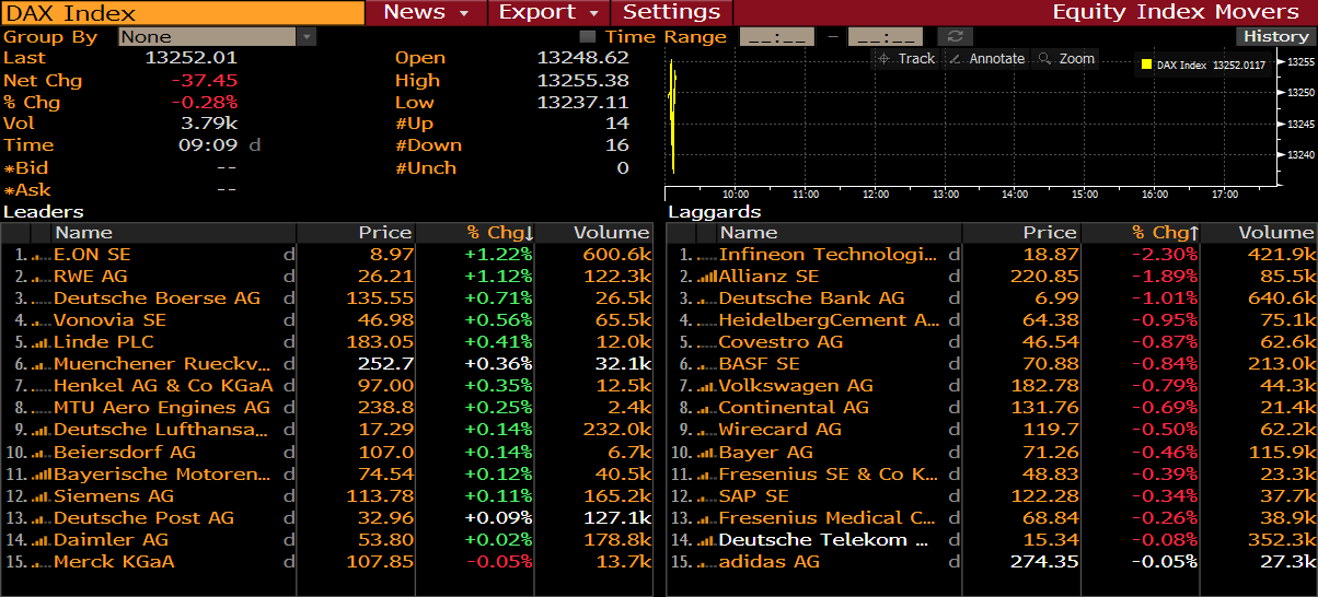 Los miembros del DAX poco después de la apertura de la sesión del viernes. Fuente: Bloomberg