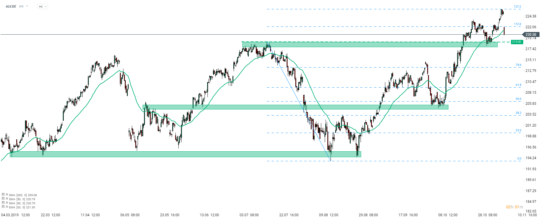 Allianz (ALV.DE) alcanzó los niveles más altos desde el primer semestre de 2002. El movimiento alcista se detuvo en el 127,2% del retroceso exterior del movimiento bajista que duró desde mediados de julio hasta mediados de agosto. Las acciones cayeron por un precipicio después de la publicación del informe de resultados del tercer trimestre. La zona de apoyo más cercana a la zona de vigilancia se sitúa por debajo del soporte de 219 euros. La acción se está rompiendo a través del promedio móvil exponencial de 33 períodos en el momento de la impresión (línea verde, €221.30 de área). Fuente: xStation5
