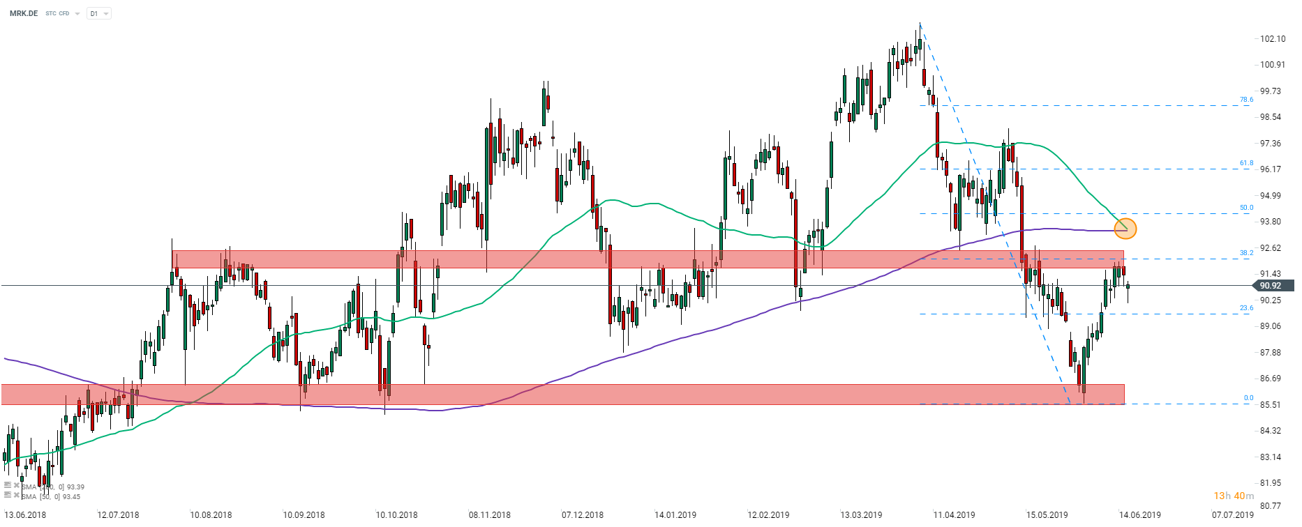 Después de un mal comienzo en el segundo trimestre de 2019, el precio de las acciones de Merck (MRK.DE) logra rebotar más alto en la zona de soporte, por encima de los 85,50 euros. Un movimiento alcista llevó a las acciones al nivel de Fibo del 38,2% durante la caída de abril-mayo. Nótese que en la misma área se puede encontrar la zona de resistencia que fue probada varias veces a lo largo del año pasado. Note que el promedio móvil de 50 y 200 sesiones está cerca de pintar una cruz de muerte (círculo naranja en la tabla de arriba) - un patrón que en teoría anuncia declives. Fuente: xStation5