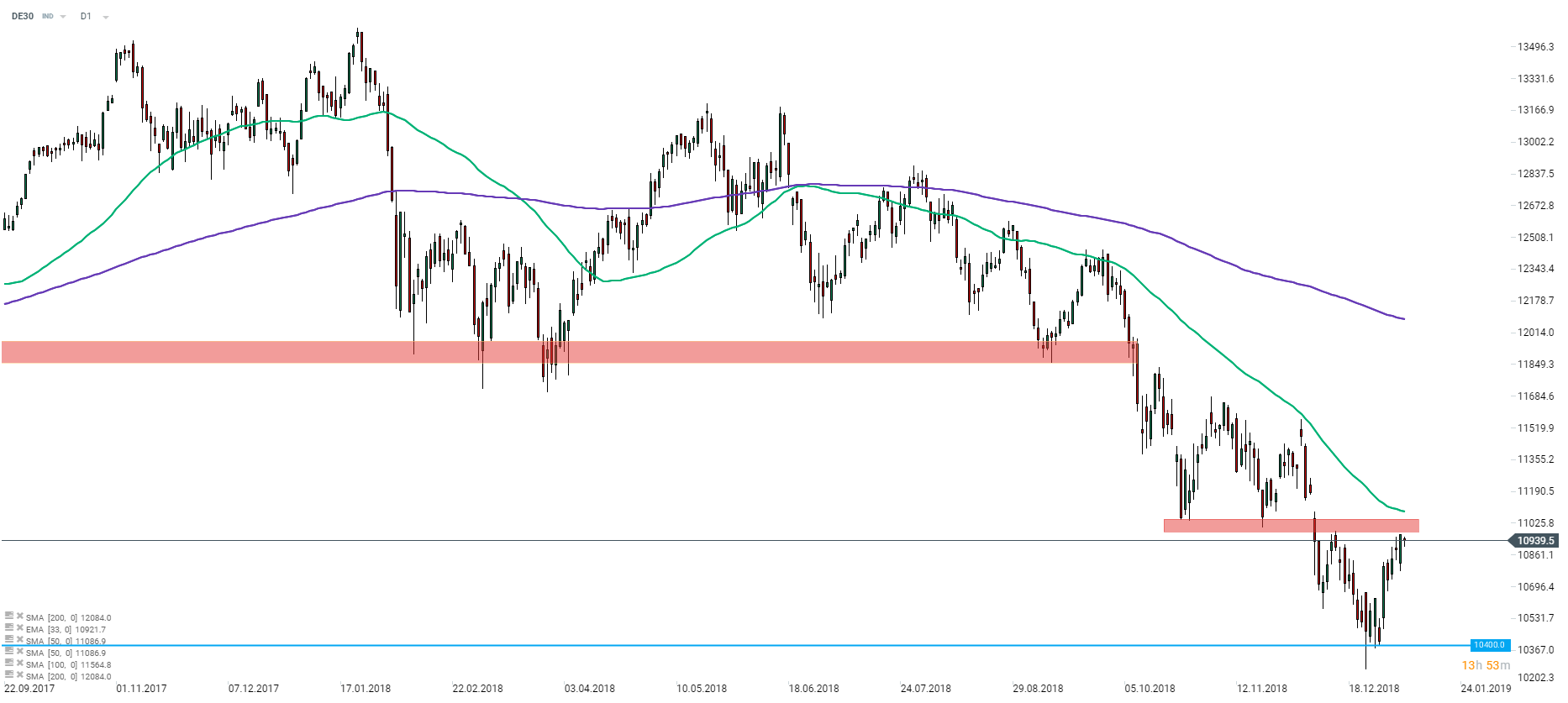 A pesar del bajo rendimiento durante la mañana de ayer, el DE30 logró terminar el jueves con el pie derecho. El índice de referencia alemán subió al final del día, solo una muesca por debajo de los 11000 pts. El índice prueba la zona de resistencia que se encuentra por encima de este nivel durante la sesión de hoy. Tenga en cuenta que será el segundo intento de romperlo después de que el primero fallara a mediados de diciembre. Fuente: xStation5