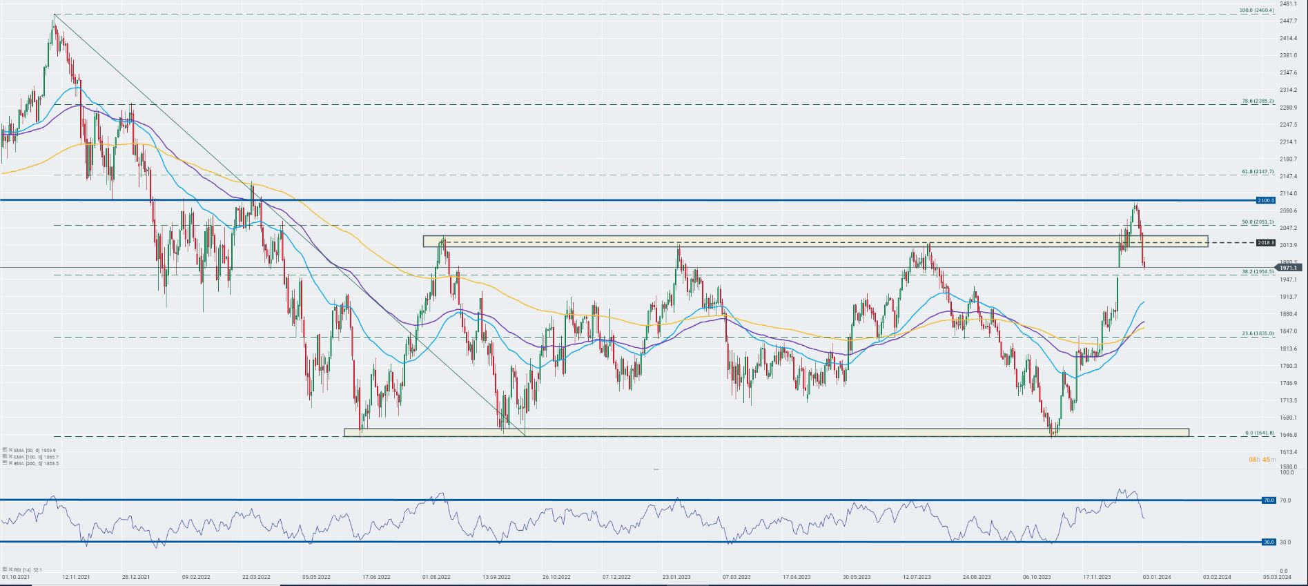 El índice US2000 continúa sus caídas y actualmente cotiza cerca de la zona de soporte definida por el retroceso Fibonacci del 38,2% de la onda descendente iniciada a finales de 2021. El nivel de resistencia más importante sigue siendo ahora la zona de picos locales cerca de los máximos de 2015.