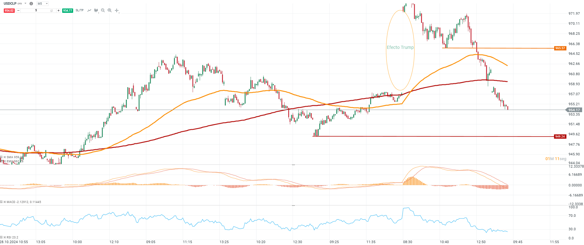 - Soporte técnico: Comportamiento del dólar en torno al nivel de 955, crucial para definir si habrá un rebote o si continuará la corrección bajista.