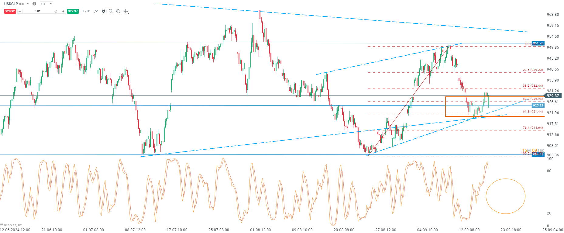 El tipo de cambio se encuentra dentro de la golden zone, correspondiente al rango de retroceso del 50.0% y 61.8% de Fibonacci, tomando como referencia el mínimo y máximo relativos del canal entre los 904 y 951. Si el precio logra mantener el nivel de los 921 (o en un escenario más crítico, los 914), podría generarse una fuerte reversión al alza, con objetivos que superarían los 951 en el mediano plazo. No obstante, si el precio pierde estos soportes clave, es probable que el USDCLP caiga por debajo de los 900 al cierre de la semana. Se espera observar el comportamiento del Estocástico para confirmar si el periodo correctivo se encuentra dentro de los parámetros adecuados para una posible entrada.