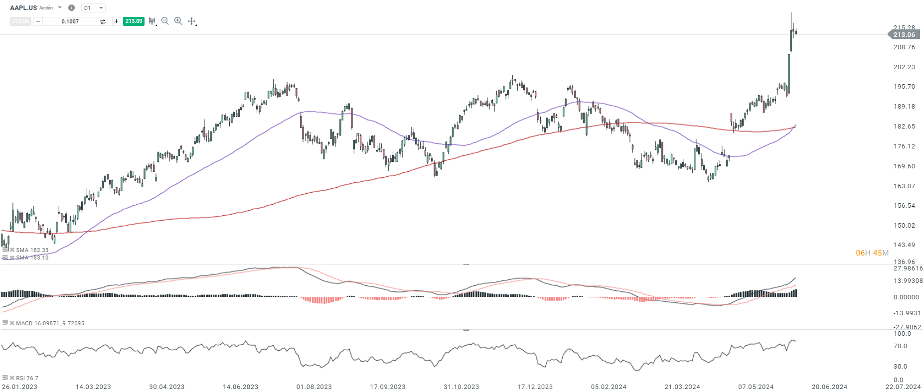 La presentación de Apple en la WWDC centrada en la IA generó expectativas positivas sobre el futuro de la empresa en este campo clave. Los inversores apuestan por un fuerte repunte en las ventas del iPhone gracias a las nuevas funciones impulsadas por la IA, lo que impulsó el repunte de las acciones de Apple.
