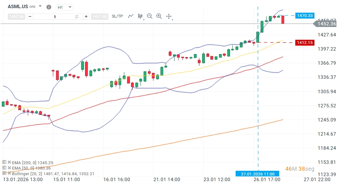 La acción de ASML comenzó fuerte al alza (27 de enero), registrando un avance intradiario cercano al 4% y estableciendo nuevos máximos históricos. Acumulando un retorno del 35,84% en lo que va del año. Este movimiento se impulsa por el éxito operativo de sus nuevos pedidos récord y un incremento sustancial en las ventas totales.
