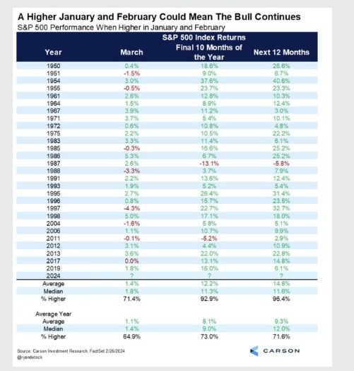 Loretta Mester mantiene la postura de tres recortes de tipos para el presente año, a partir de la segunda mitad del año. Actividad manufacturera en china se ralentiza en el mes de febrero, Pekín ha puesto en marcha una serie de medidas de estímulo monetario en los últimos meses en un esfuerzo por apuntalar el crecimiento. Desde 1950, cuando el SP500 cotiza con alzas enero y febrero, de las 29 ocasiones anteriores, la bolsa se ha mantenido en alzas por marzo en 21 ocasiones.