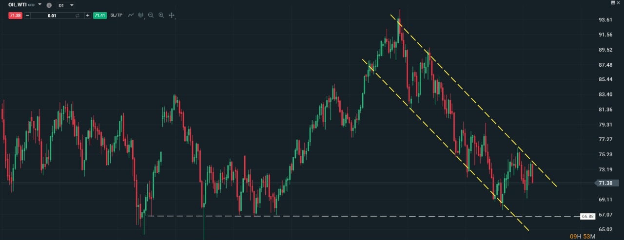 Los precios del petróleo caen este lunes después de que Arabia Saudí recortara los precios de sus exportaciones de crudo asiático hasta mínimos de más de dos años, sumándose a la narrativa actual de que la demanda mundial sigue siendo débil. Esto se traduce en un WTI que se encuentra en torno a los 70 dólares el barril. Respetando el canal bajista que trae desde septiembre del 2023.