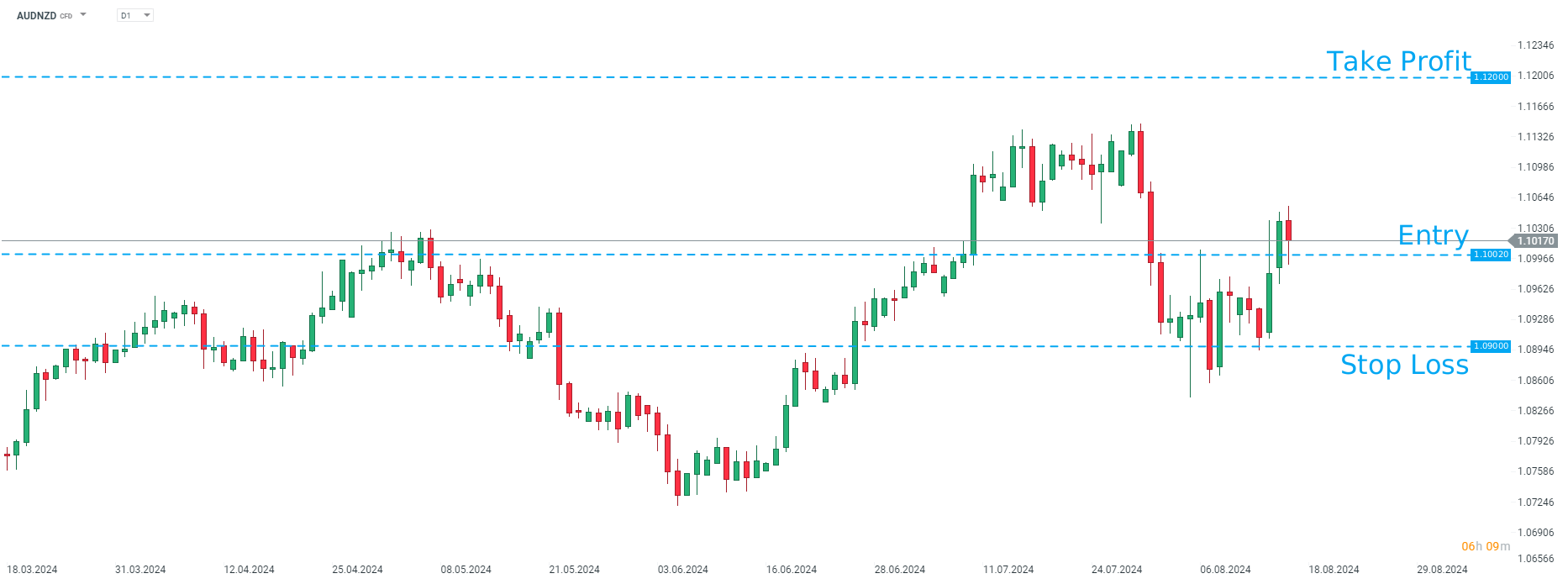 ANZ Research recomienda tomar una posición larga en AUD-NZD al precio de mercado con un objetivo de 1,1200 y una orden de stop loss colocada en 1,0900. Fuente: xStation5