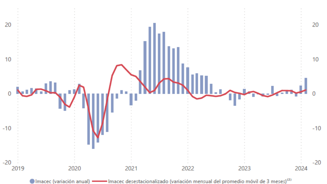El Imacec de febrero de 2024 creció 4,5% en comparación con igual mes del año anterior. El mes registró un día más que febrero de 2023 como consecuencia del año bisiesto.