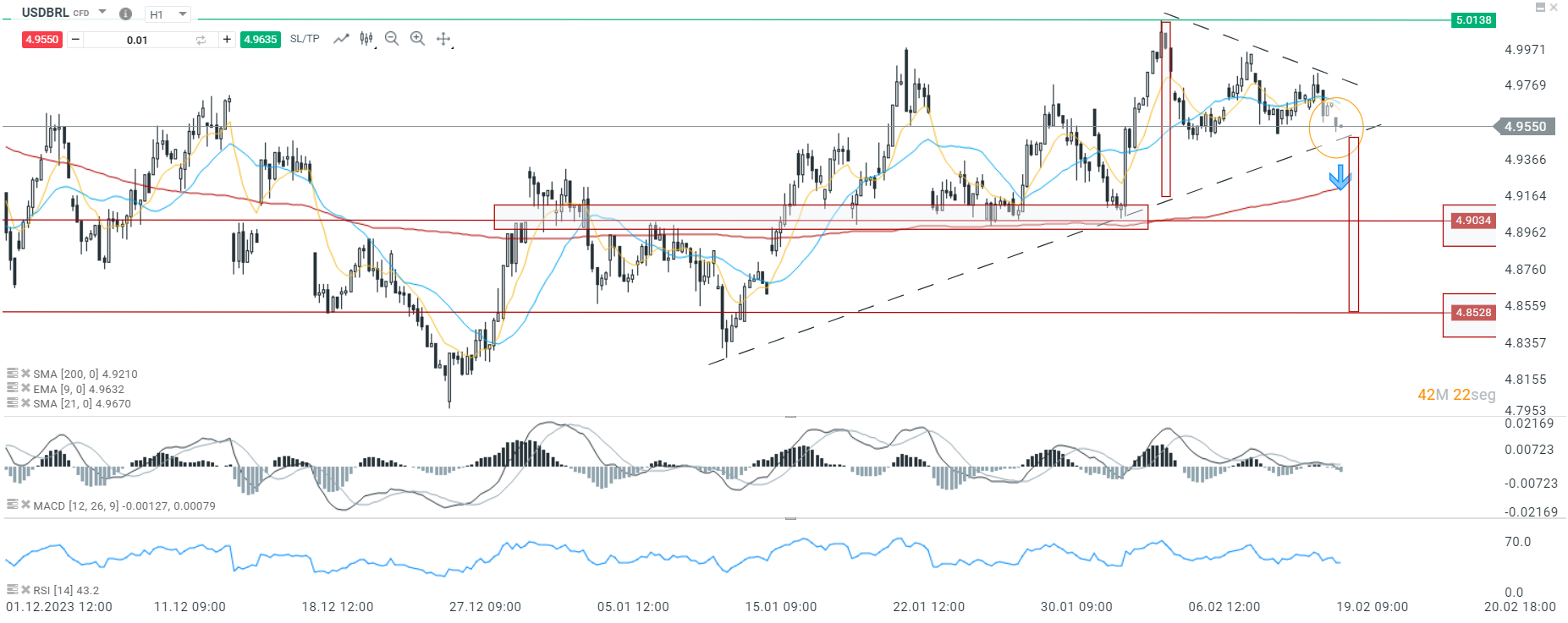 El tipo de cambio del real brasileño mostró un fortalecimiento en el índice, situando el precio actual en 4.9551. Se observa una divergencia entre los máximos y mínimos, formando una figura de triángulo simétrico. Por tanto, la ruptura de estas líneas directrices podría indicar la dirección futura del índice. Fuente: xStation 5