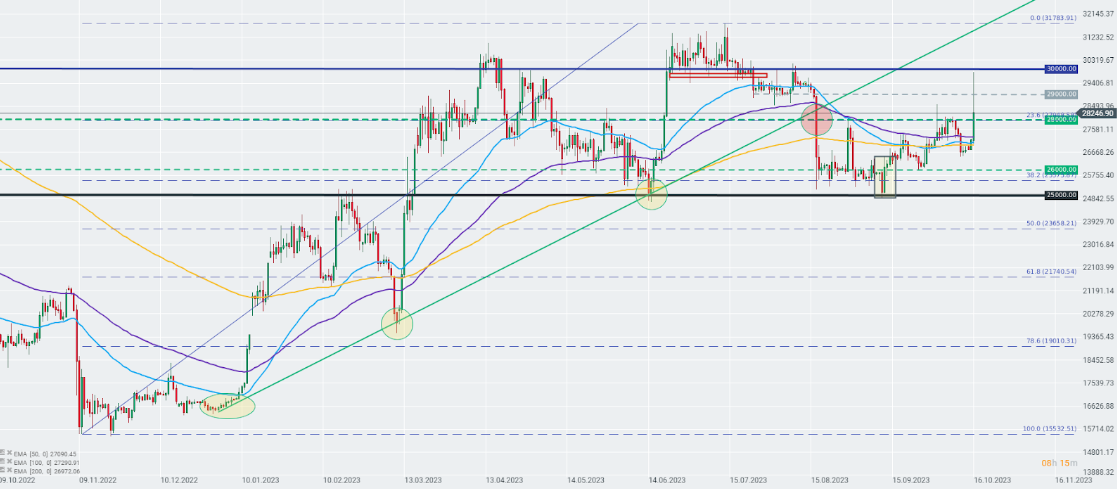 Bitcoin reaccionó bruscamente a noticias no confirmadas sobre la aceptación del fondo ETF al contado de iShares. La criptomoneda probó brevemente las zonas límite de la barrera de los 30.000 $. Después del anuncio de BlackRock, afirmando que estos informes eran falsos, el repunte de la criptomoneda fue en gran medida compensado. Fuente: xStation5