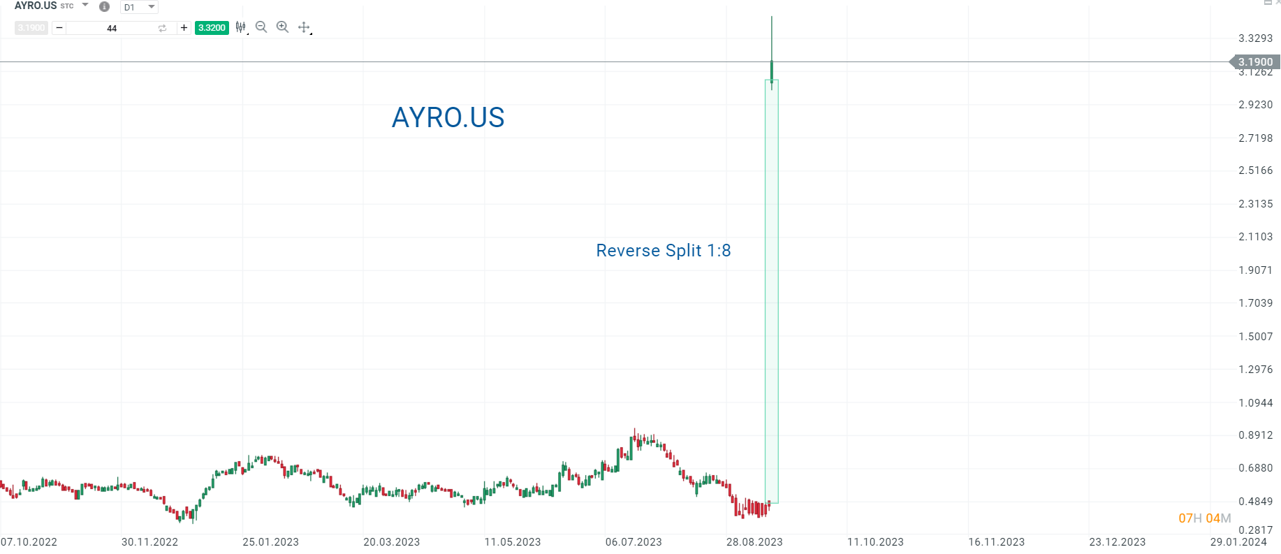 A pesar de que la variación diaria supera el 500%, ajustado por el reverse-split, las acciones de AYRO retroceden en la sesión un 15,5%. Fuente: xStation