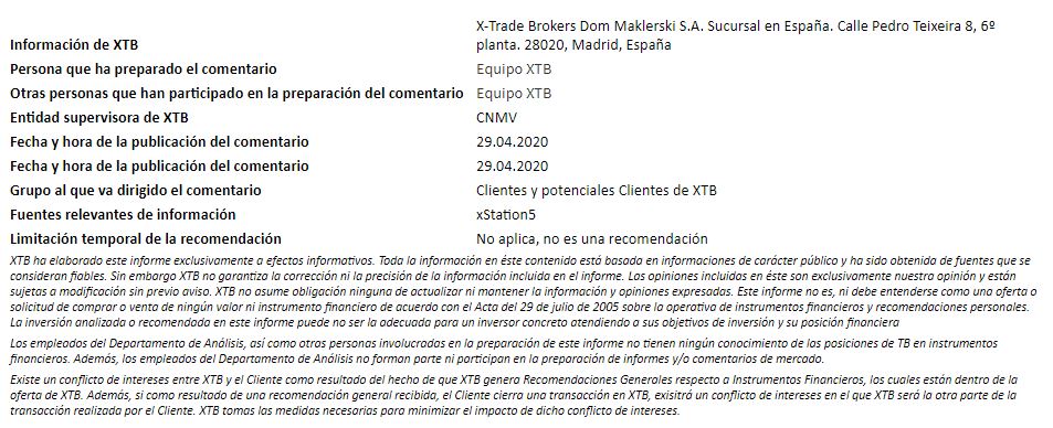 "Este informe se proporciona sólo con fines de información general y con fines educativos. Cualquier opinión, análisis, precio u otro contenido no constituyen asesoramiento de inversión o recomendación en entendimiento de la ley de Belice. El rendimiento en el pasado no indica necesariamente los resultados futuros, y cualquier persona que actúe sobre esta información lo hace bajo su propio riesgo. XTB no aceptará responsabilidad por ninguna pérdida o daño, incluida, sin limitación, cualquier pérdida de beneficio, que pueda surgir directa o indirectamente del uso o la confianza de dicha información. Los contratos por diferencias (""CFDs"") son productos con apalancamiento y acarrean un alto nivel de riesgo. Asegúrese de comprender los riesgos asociados. "