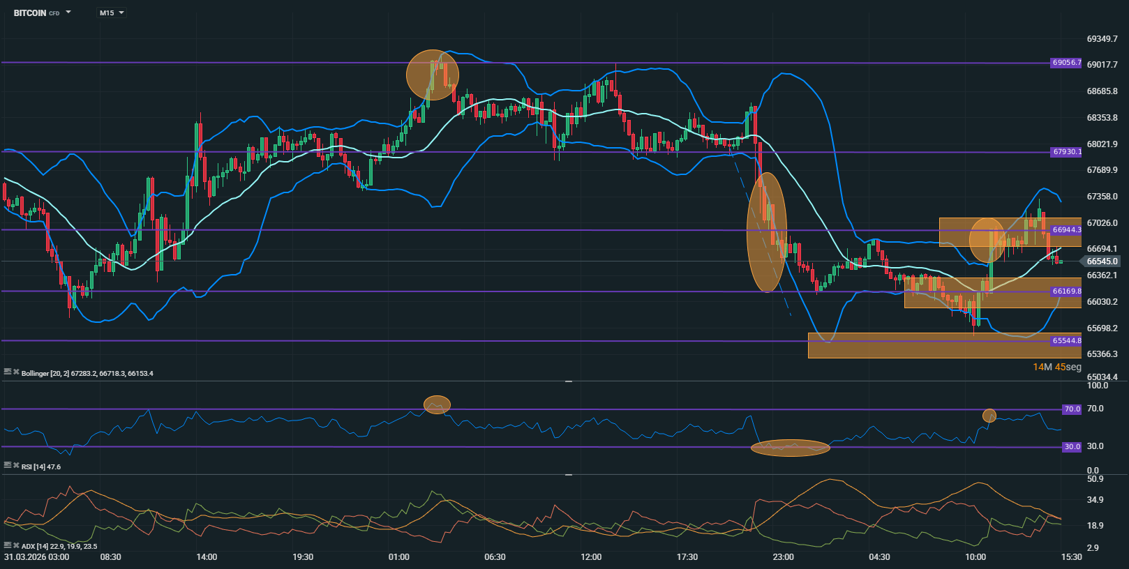 El BITCOIN en M15 presenta una estructura correctiva tras un impulso bajista previo, donde la caída desde la zona de 67930 genera un quiebre de estructura y expansión de volatilidad reflejada en la apertura de las bandas de Bollinger hacia la baja. Posteriormente, el precio desarrolla un rebote técnico desde la zona de 65544–66169, donde se identifica una base de consolidación, y comienza a construir máximos y mínimos ascendentes de corto plazo. Actualmente, el precio se ubica por debajo de la zona de 66944, que actúa como resistencia inmediata, mientras la media móvil comienza a aplanarse, indicando pérdida de direccionalidad en el corto plazo. Las bandas de Bollinger se contraen tras la expansión previa, lo que sugiere compresión de volatilidad en esta fase de consolidación.