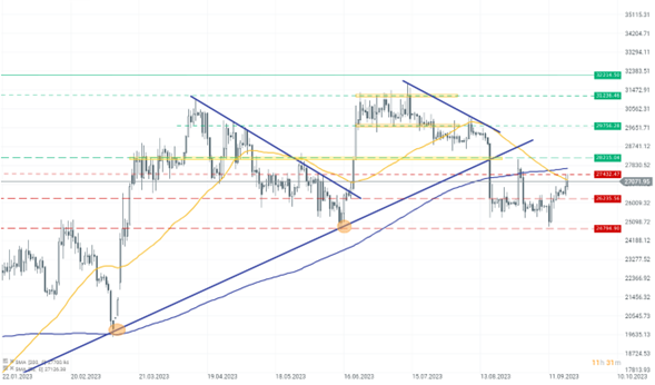 Al observar el gráfico D1 de Bitcoin, el precio rompió la consolidación en la que se encontraba desde mediados de agosto. Si los alcistas mantienen el poder adquisitivo, el siguiente nivel de resistencia podría estar entre 28.100 y 28.400 dólares. Cabe señalar que todavía estamos en un período de acumulación en el mercado de las criptomonedas, y todavía hay varios problemas importantes que se ciernen sobre el mercado que pueden empujar dinámicamente el precio a nuevos mínimos.