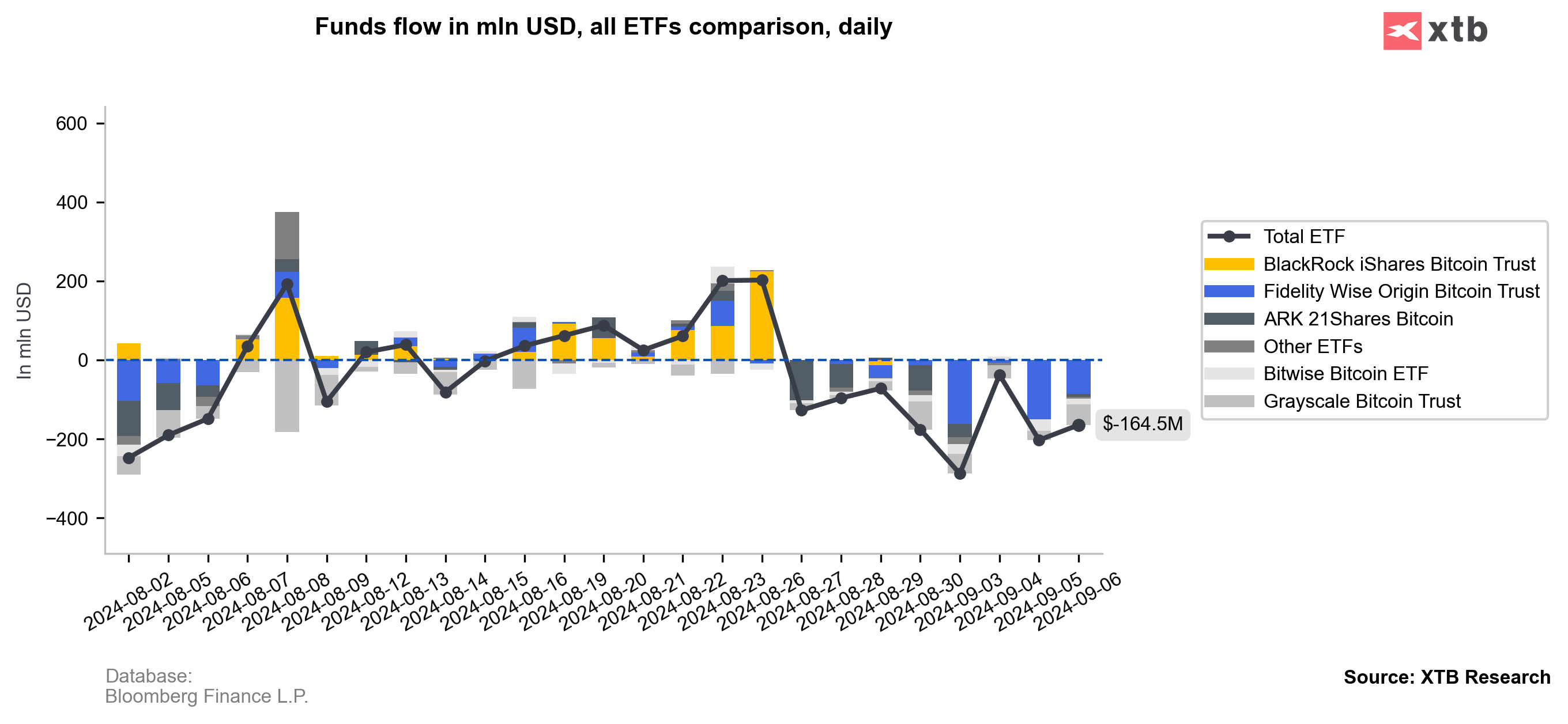 Los ETF spot de Bitcoin han experimentado salidas netas de más de 1.200 millones de dólares en las últimas ocho sesiones. Los inversores obtuvieron ganancias a medida que aumentaba la incertidumbre sobre la sostenibilidad del repunte tras el pánico de principios de agosto. Fuente: Bloomberg Finance L.P. XTB Research