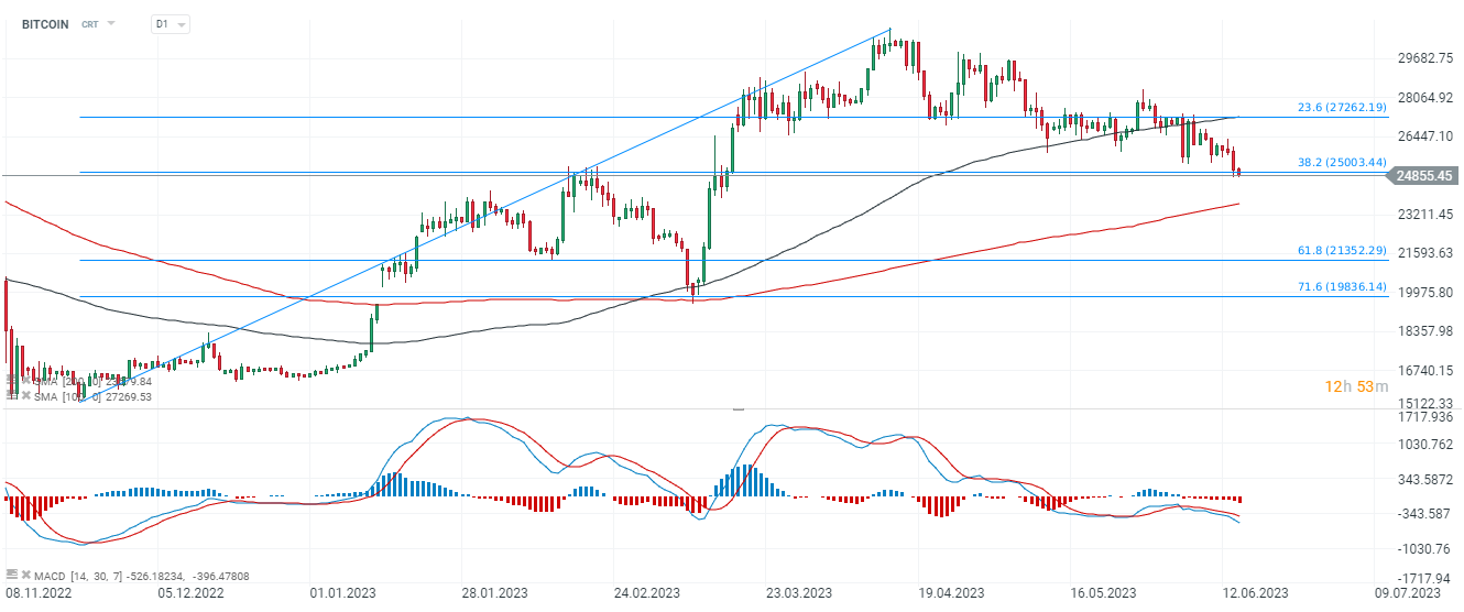 BITCOIN, intervalo D1. El precio ha caído por debajo de 25.000 $ y si el nivel no se recupera relativamente rápido, no se descartará una prueba del retroceso de Fibonacci 61.8%, alrededor de 21.300 $; en el entorno de estas alzas también el llamado precio precio realizado, es decir, el precio medio de las compras de todos los BTC desde el comienzo de la historia comercial: este promedio ha servido como un indicador de tendencia importante en muchos ciclos anteriores. Fuente: xStation5