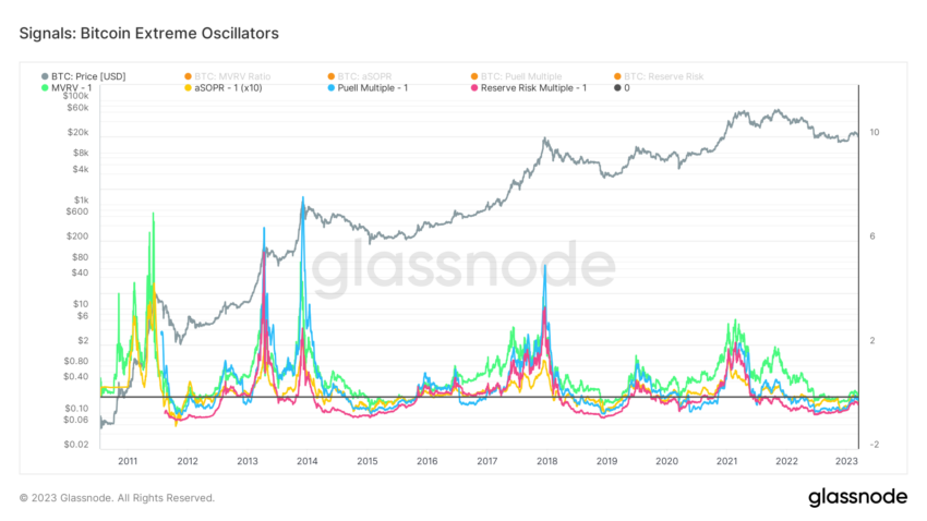 El gráfico anterior de Glassnode muestra condiciones extremas, mostrando los cuatro indicadores más populares históricamente útiles para determinar el nivel de sobreventa y el comportamiento futuro de BTC. MVRV (verde) indica la ganancia/pérdida no realizada del mercado general. El indicador aSOPR (amarillo) mide los niveles extremos de ganancias y pérdidas realizadas. Puell Multiple (azul) muestra la rentabilidad y los ingresos de los mineros, y Reserve Risk (rojo) muestra el grado de participación de los llamados HODLers, que históricamente son los menos propensos a vender BTC. Los 4 indicadores están cerca del nivel neutral de 1, que históricamente generalmente ha precedido a los aumentos. Sin embargo, esta situación no necesariamente se repetirá en un entorno potencialmente crítico. Fuente: Glassnode