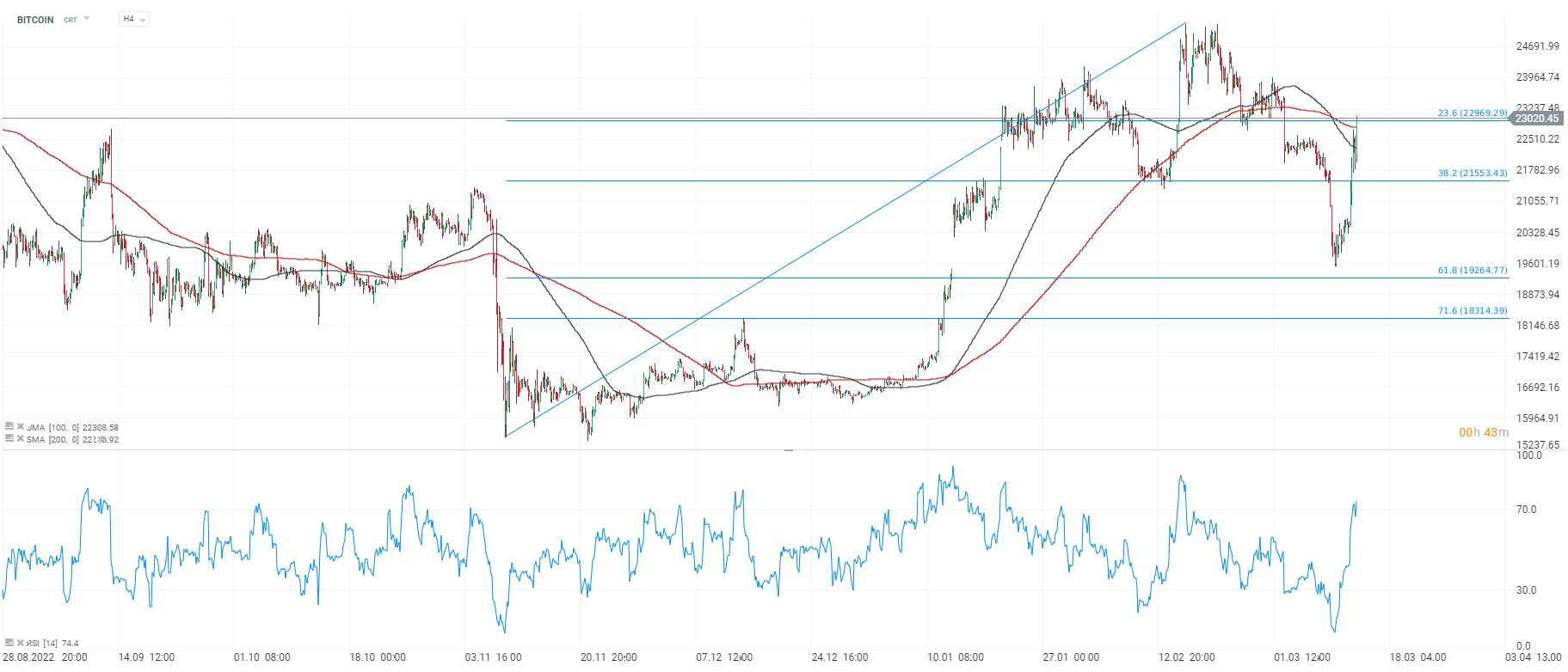 Gráfico de Bitcoin, intervalo H1. El precio ha subido por encima de las medias SMA200 (rojo), SMA100 (negro) y SMA50 (amarillo), así como el retroceso de Fibonacci de 38,2 de la ola alcista que comenzó en el otoño de 2022. Los niveles de precios clave para mantener parecen ser los Rango de 21.500$-22.000$ con un posible repunte hacia 23.200$ si resurge el sentimiento de riesgo. Estos niveles coinciden con la eliminación de Fibonacci de 23,6. El soporte potencial está en 19.700$, lo que coincide con las reacciones de precios anteriores y el retroceso de Fibonacci 61.8 en 19.700$. Fuente: xStation5
