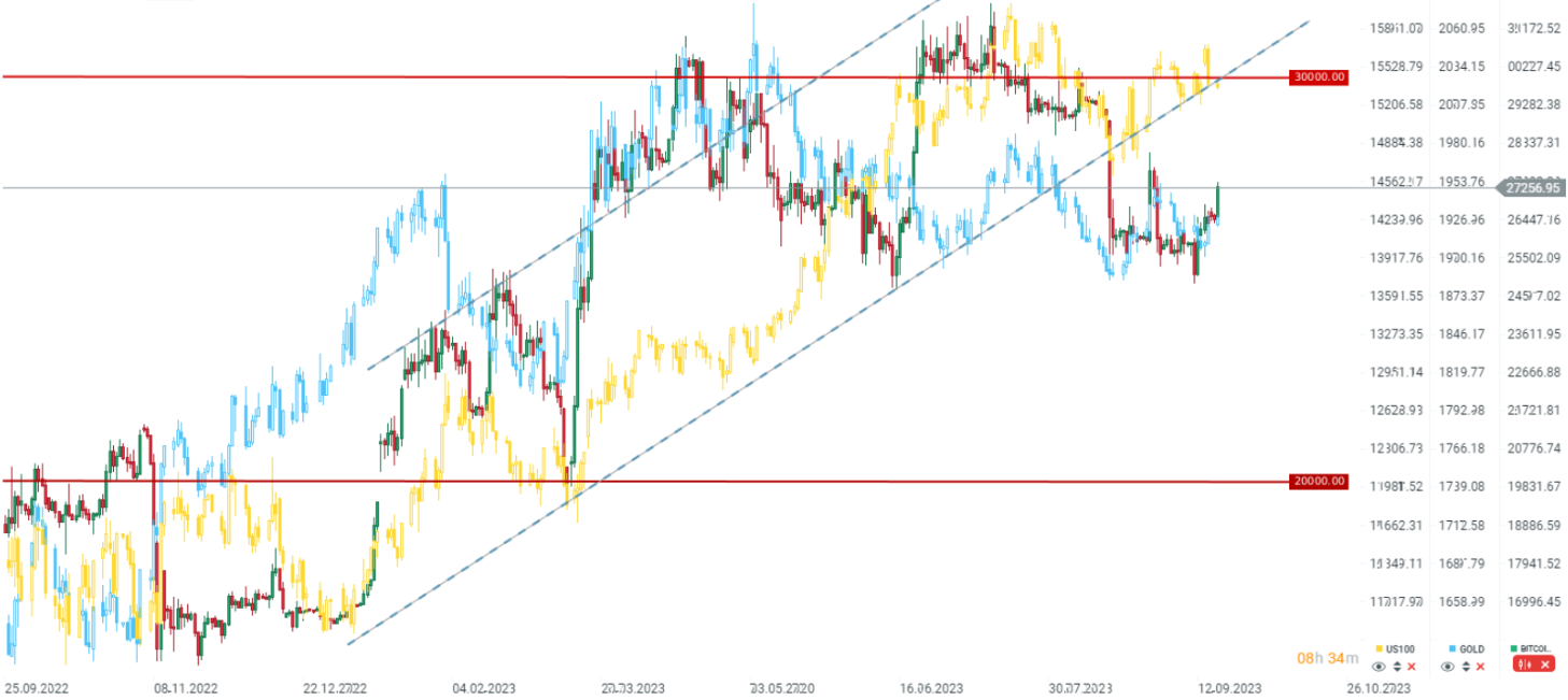 Hoy estamos observando un amplio repunte en el mercado de las criptomonedas. Curiosamente, no estamos viendo grandes movimientos en el mercado de divisas, principalmente en el dólar. En los últimos meses hemos asistido a un retorno a la correlación entre Bitcoin y otras clases de activos como los índices de Wall Street o el oro. A pesar de que hoy ha sido un día menos atractivo para el índice Nasdaq 100, Bitcoin está ganando, lo que también va de la mano con las subidas del oro. Esto puede estar relacionado con la próxima reunión de la Reserva Federal, que podría poner fin al ciclo de subidas de tipos de interés. En el pasado, Bitcoin se benefició de una ola de debilidad del dólar causada, entre otras cosas, por la disminución de las expectativas de una subida. Si la Reserva Federal se muestra moderada ahora, podría haber un avance de 28.000 $ y un intento de probar los 30.000 $. Después de eso, el nivel de 32.000 $ es el más alto desde mayo de 2022.
