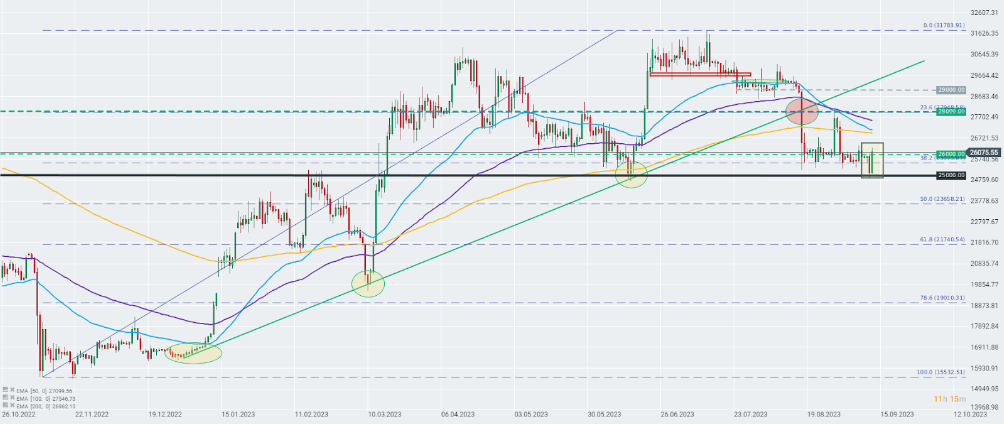 BITCOIN detuvo el impulso bajista casi exactamente en la zona de soporte psicológico en el nivel de 25.000 $, y hoy el precio de la criptomoneda más popular volvió a superar los 26.000 $. Desde la perspectiva del análisis técnico, vale la pena señalar la formación de una formación de envolvente alcista incompleta, que en cierto modo está en desacuerdo con el cruce mencionadao anteriormente de las SMA de 50 y 200 días, lo que indica el llamado "cruce de la muerte". Formacion, visto como un momento de iniciar un mercado bajista. Fuente: xStation5