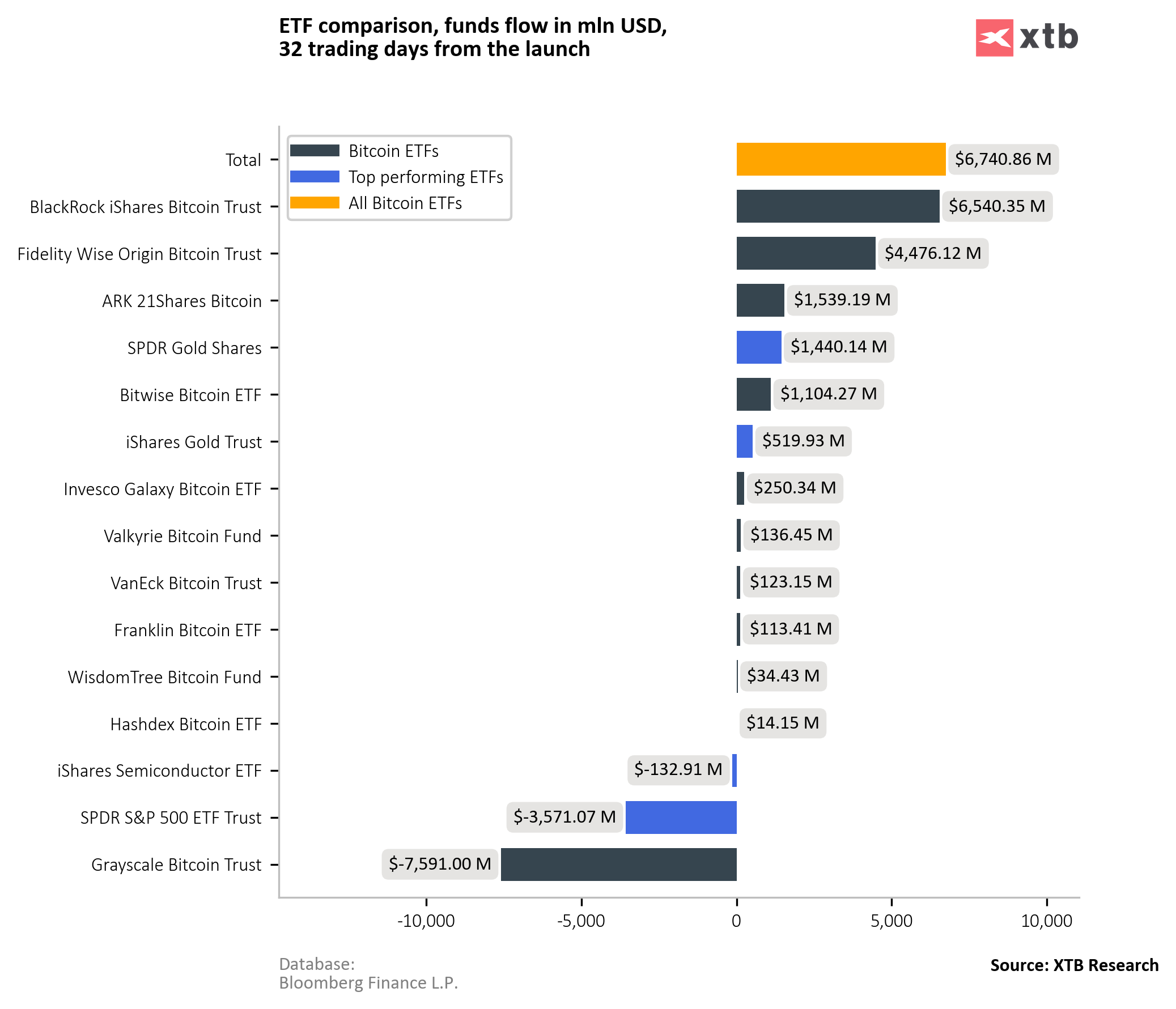 En los 32 días de negociación transcurridos desde el lanzamiento de los ETF, BlackRock ha acumulado Bitcoins valorados en más de 6.500 millones de dólares, seguido de Fidelity con más de 4.400 millones de dólares.