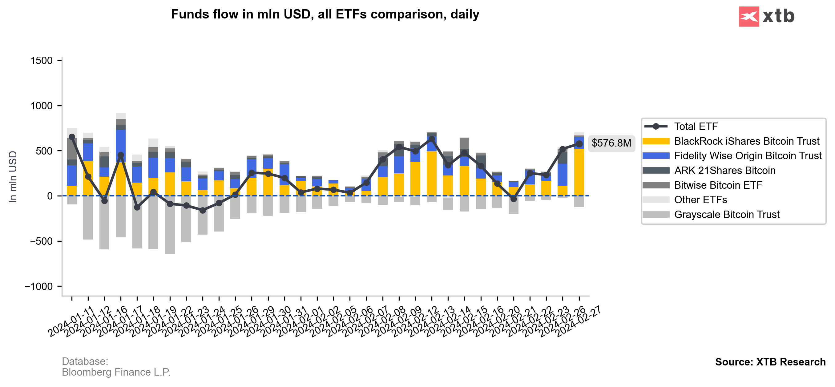 Bitcoin ha subido más del 6,0% y ha superado el nivel de 60.000 dólares, acercándose muy cerca de sus máximos históricos de 2021. El crecimiento dinámico de la mayor criptomoneda está impulsado por las entradas positivas en los ETF, que hasta la fecha han ascendido a más de 6.700 millones de dólares, incluidas las salidas de Grayscale.