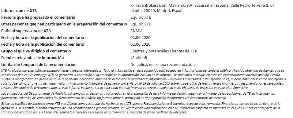 "Este informe se proporciona sólo con fines de información general y con fines educativos. Cualquier opinión, análisis, precio u otro contenido no constituyen asesoramiento de inversión o recomendación en entendimiento de la ley de Belice. El rendimiento en el pasado no indica necesariamente los resultados futuros, y cualquier persona que actúe sobre esta información lo hace bajo su propio riesgo. XTB no aceptará responsabilidad por ninguna pérdida o daño, incluida, sin limitación, cualquier pérdida de beneficio, que pueda surgir directa o indirectamente del uso o la confianza de dicha información. Los contratos por diferencias (""CFDs"") son productos con apalancamiento y acarrean un alto nivel de riesgo. Asegúrese de comprender los riesgos asociados. "