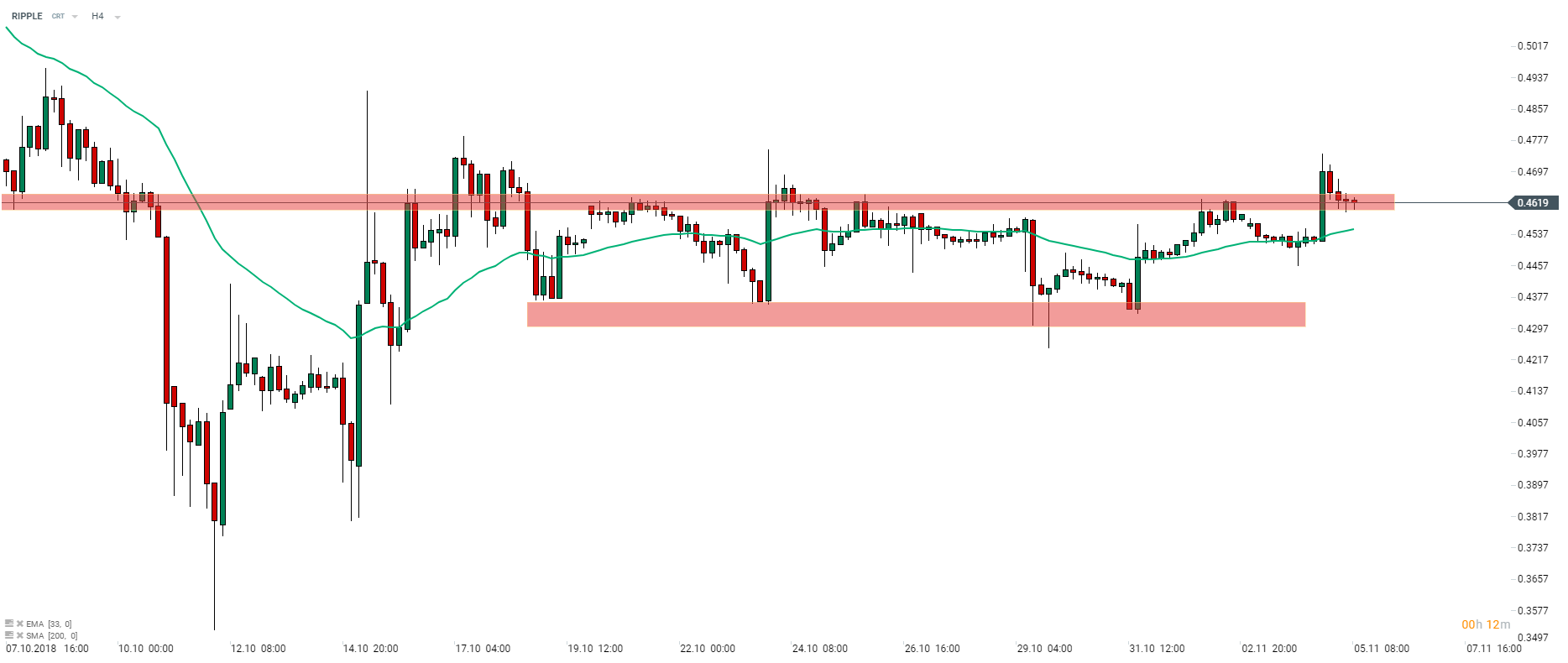 Dada la correlación entre las principales criptomonedas, las cuales fluctúan de forma análoga la mayor parte del tiempo, no sorprende observar en el RIPPLE un estado similar al del BITCOIN. El primero rompió al alza la zona de precios por encima del límite superior del rango de consolidación, si bienal inicio de la sesión actual se ha revertido a la baja. No obstante, nótese que las últimas velas en el gráfico a 4H nuestran una tendencia bajista más moderada. Fuente: xStation5