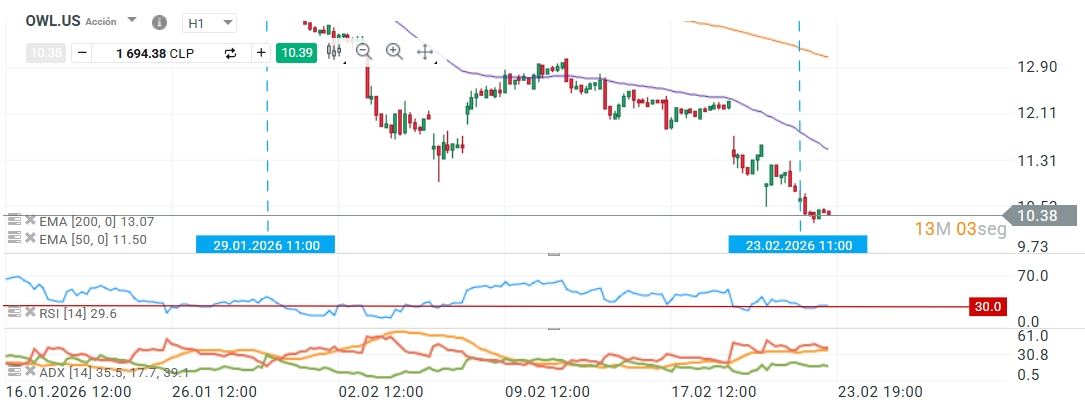 Blue Owl Capital (OWL.US) atraviesa una fase de capitulación, negociando actualmente en los US$ 10,38. Este desplome, que acumula una pérdida del 15% en apenas una semana, refleja una profunda desconfianza de los inversionistas ante el bloqueo de retiros y el elevado gasto de capital destinado a inteligencia artificial. El mercado ha castigado la falta de transparencia y la erosión de la credibilidad productiva de la firma, reduciendo su valor bursátil a menos de la mitad desde los máximos del año pasado.