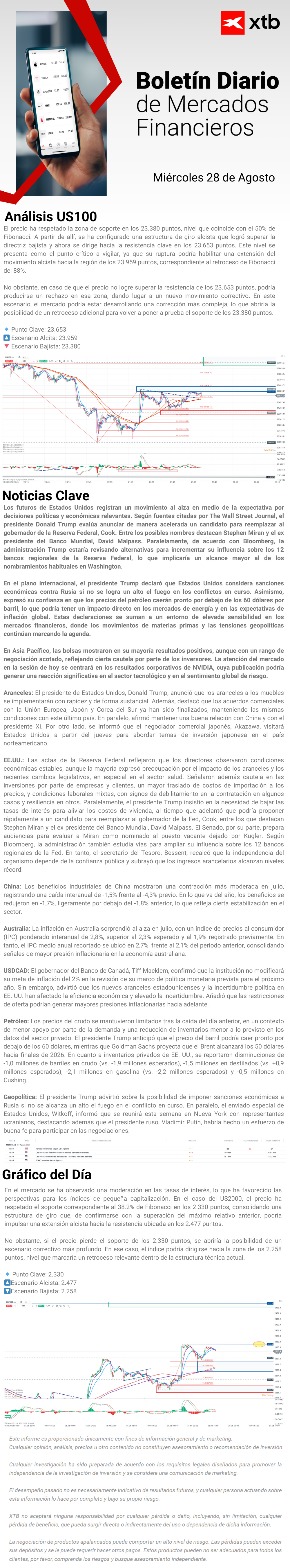 "Este informe se proporciona sólo con fines de información general y con fines educativos. Cualquier opinión, análisis, precio u otro contenido no constituyen asesoramiento de inversión o recomendación en entendimiento de la ley de Belice. El rendimiento en el pasado no indica necesariamente los resultados futuros, y cualquier persona que actúe sobre esta información lo hace bajo su propio riesgo. XTB no aceptará responsabilidad por ninguna pérdida o daño, incluida, sin limitación, cualquier pérdida de beneficio, que pueda surgir directa o indirectamente del uso o la confianza de dicha información. Los contratos por diferencias (""CFDs"") son productos con apalancamiento y acarrean un alto nivel de riesgo. Asegúrese de comprender los riesgos asociados. "