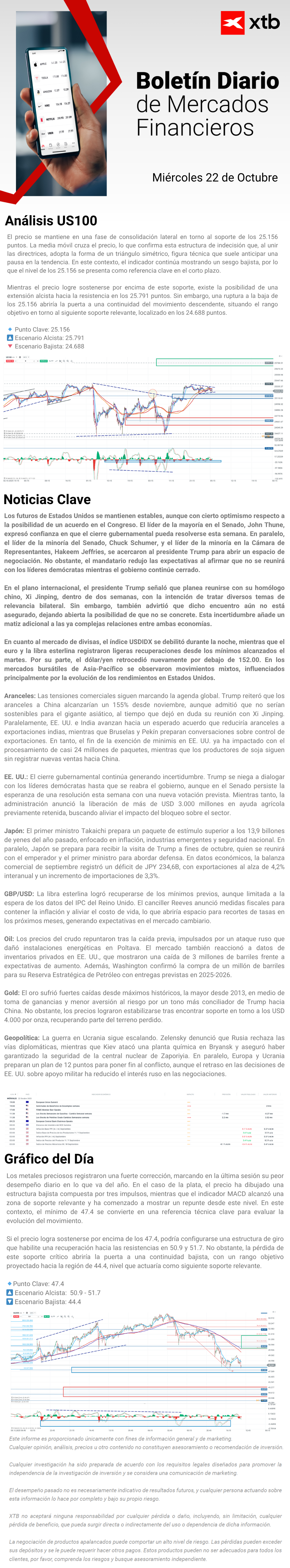"Este informe se proporciona sólo con fines de información general y con fines educativos. Cualquier opinión, análisis, precio u otro contenido no constituyen asesoramiento de inversión o recomendación en entendimiento de la ley de Belice. El rendimiento en el pasado no indica necesariamente los resultados futuros, y cualquier persona que actúe sobre esta información lo hace bajo su propio riesgo. XTB no aceptará responsabilidad por ninguna pérdida o daño, incluida, sin limitación, cualquier pérdida de beneficio, que pueda surgir directa o indirectamente del uso o la confianza de dicha información. Los contratos por diferencias (""CFDs"") son productos con apalancamiento y acarrean un alto nivel de riesgo. Asegúrese de comprender los riesgos asociados. "